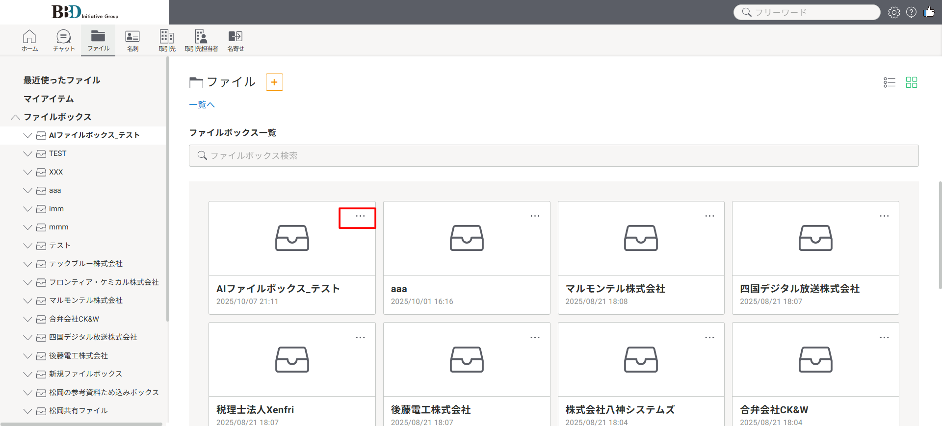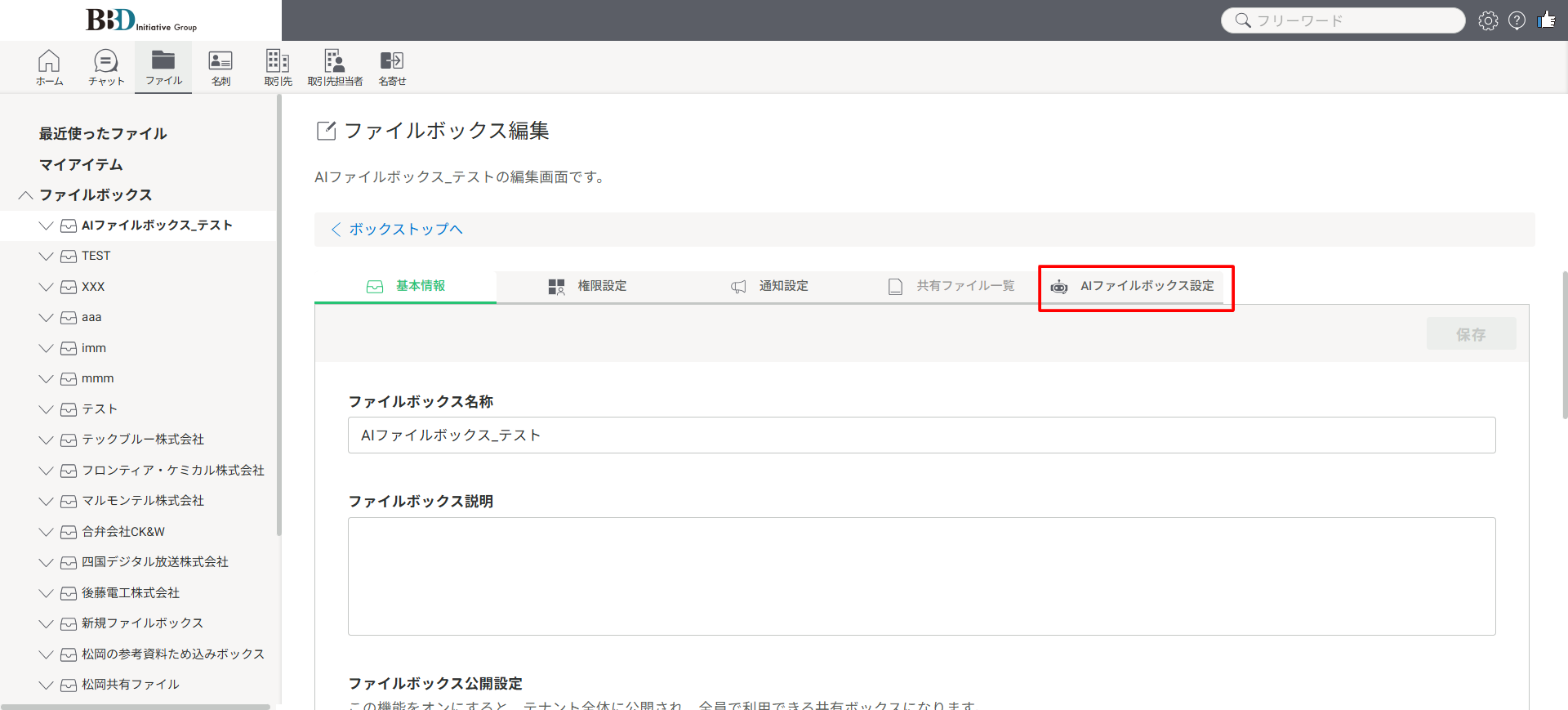 ●ファイルボックスの一覧から、設定を行いたいAIファイルボックスを選択し、赤枠部分の