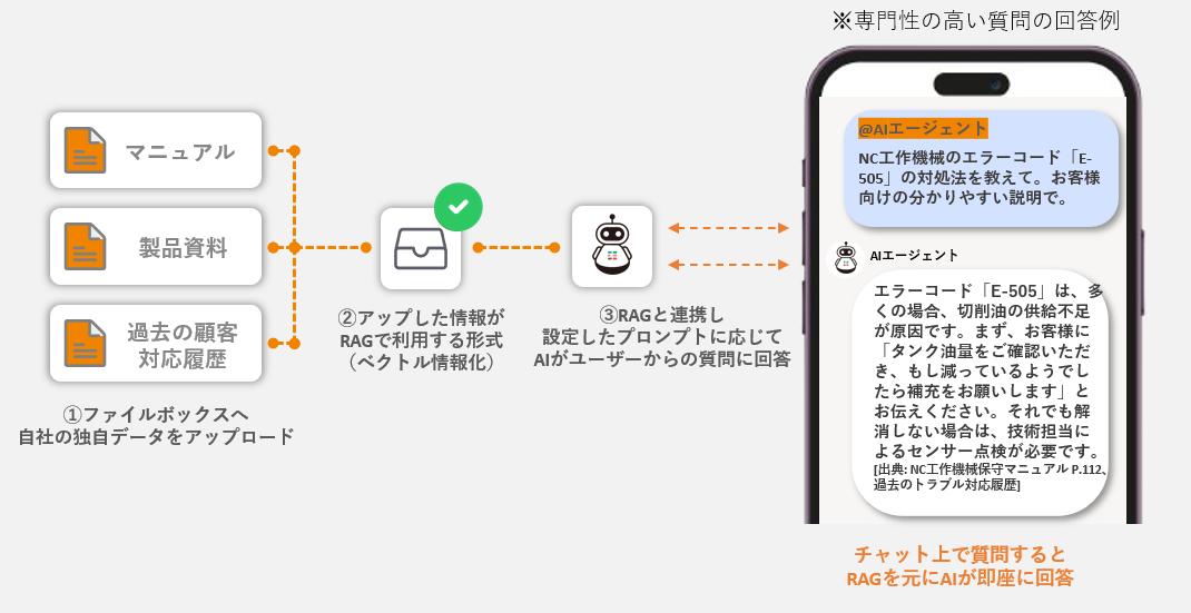 RAG技術を活用したAIエージェントサービスです。会社固有の情報が記載されたファイルをAIファイルボックスにアップロードするだけで、社内のあらゆる資料を元に、クローズドで対話可能なAIエージェントを作成できます。