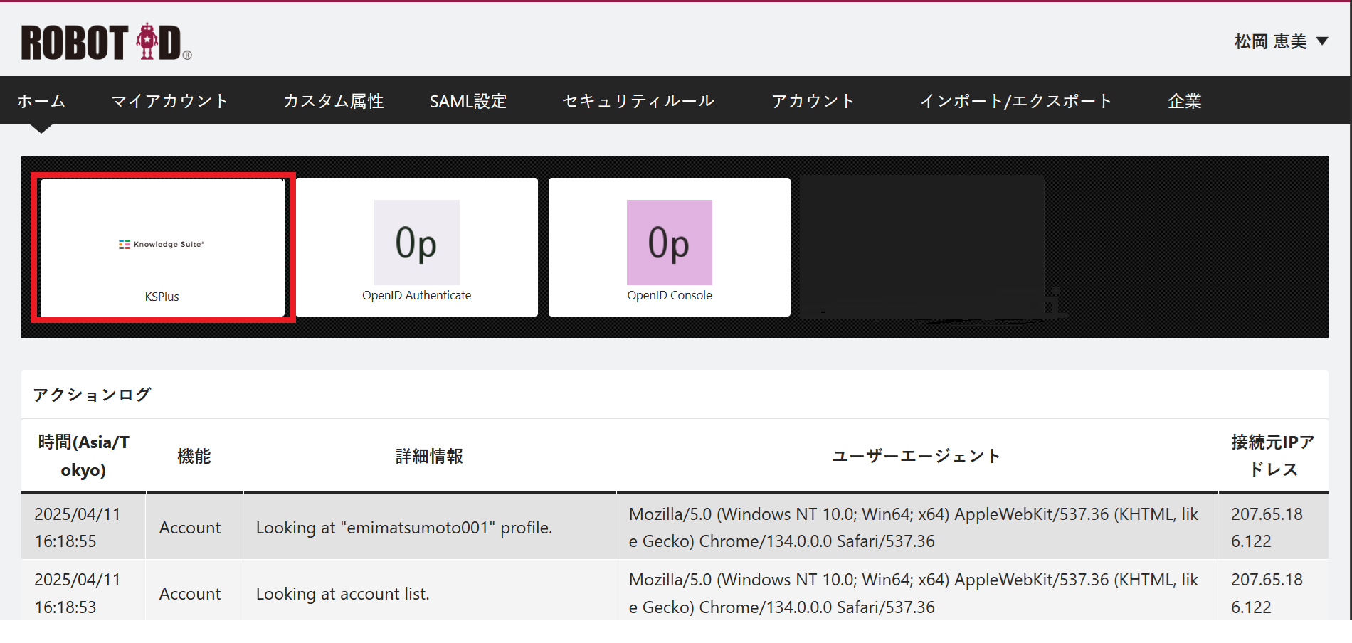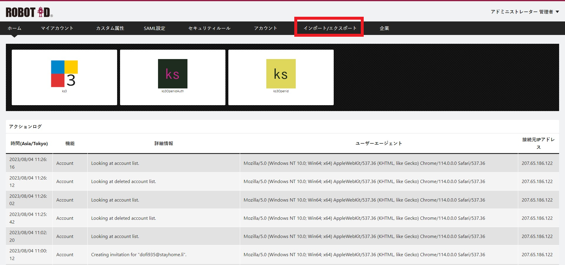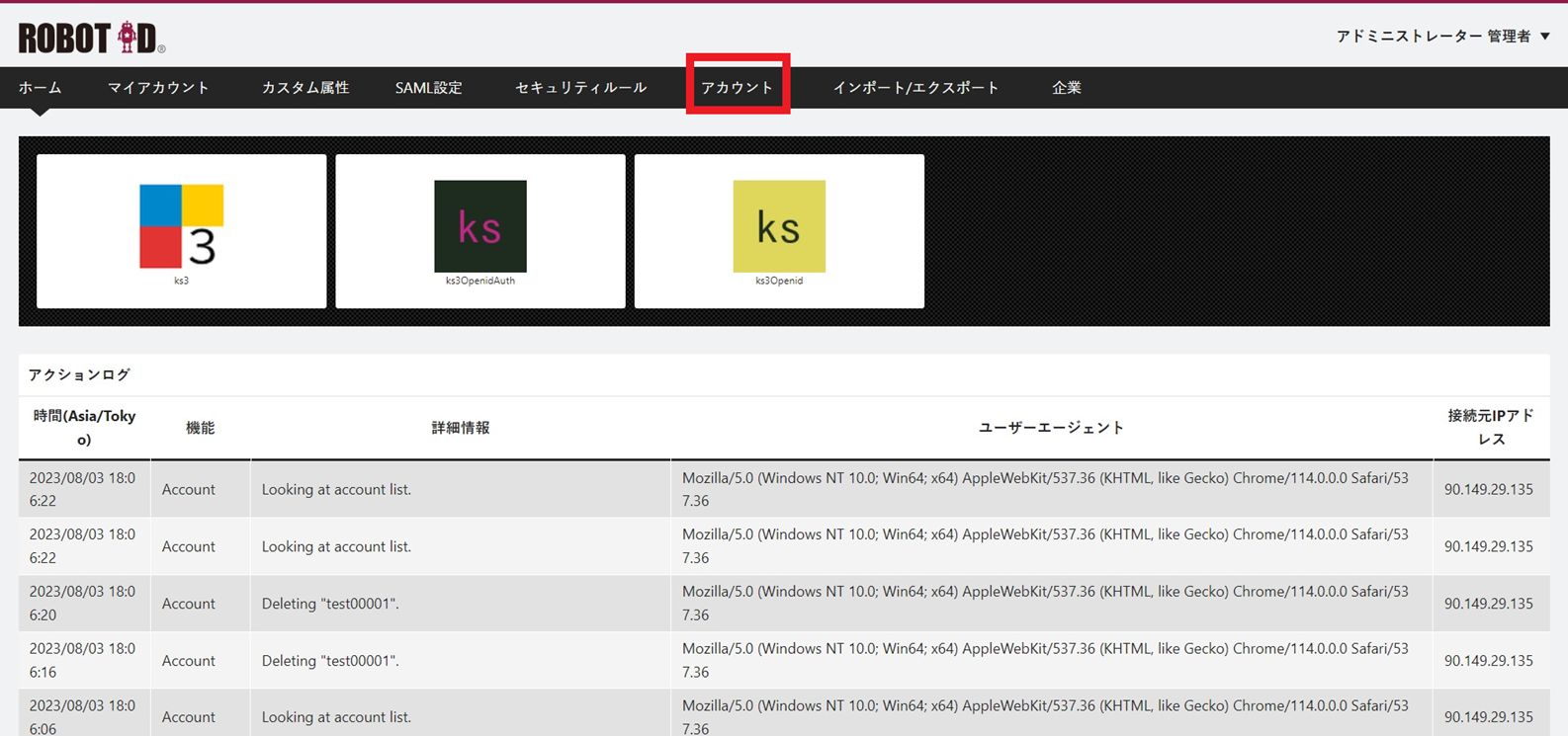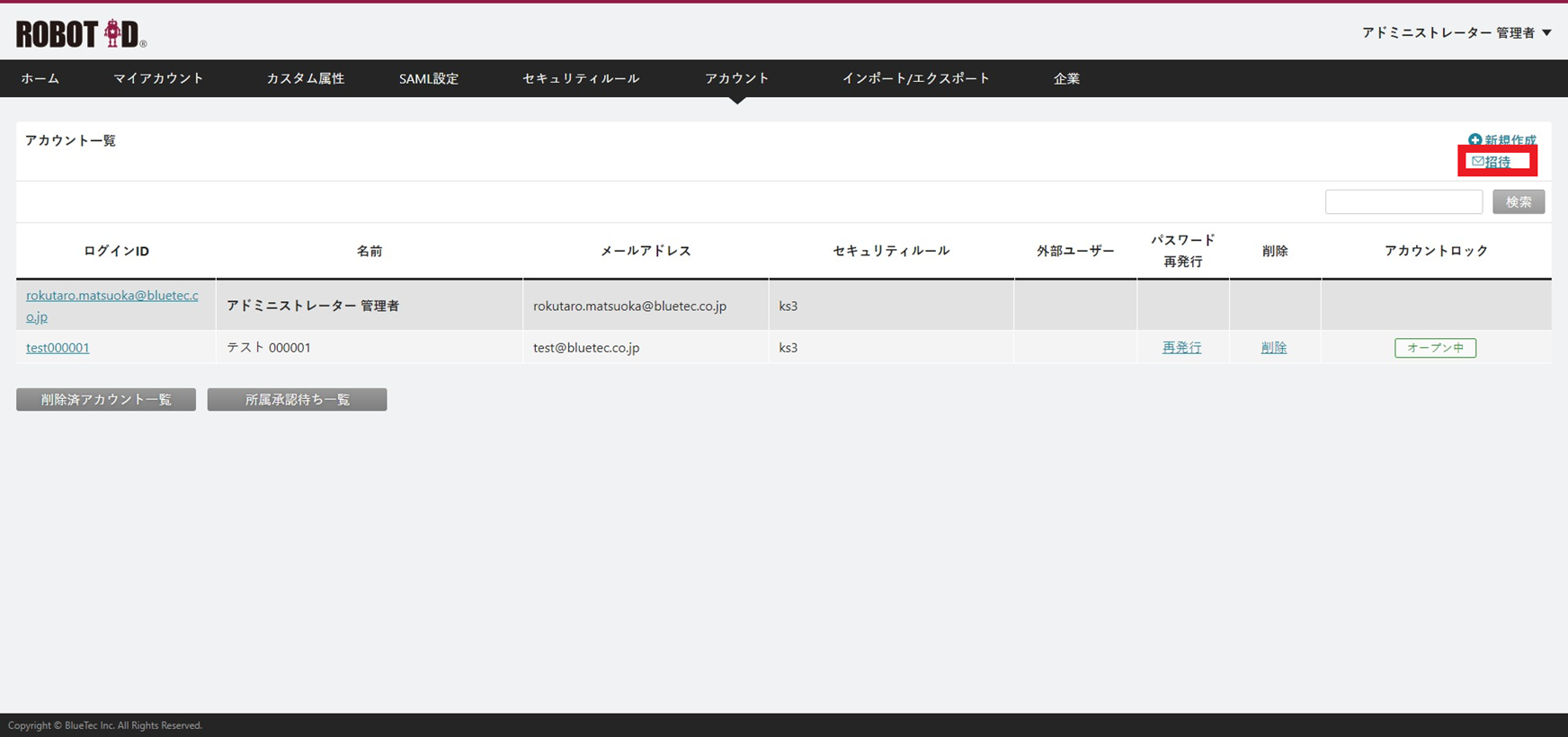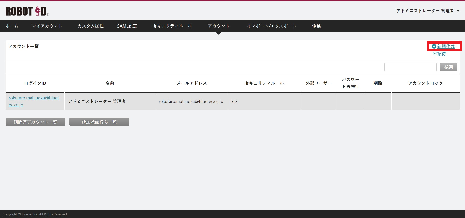 1.ROBOT IDにログインし、ホーム画面上部のメニューから[アカウント]を押下します。
