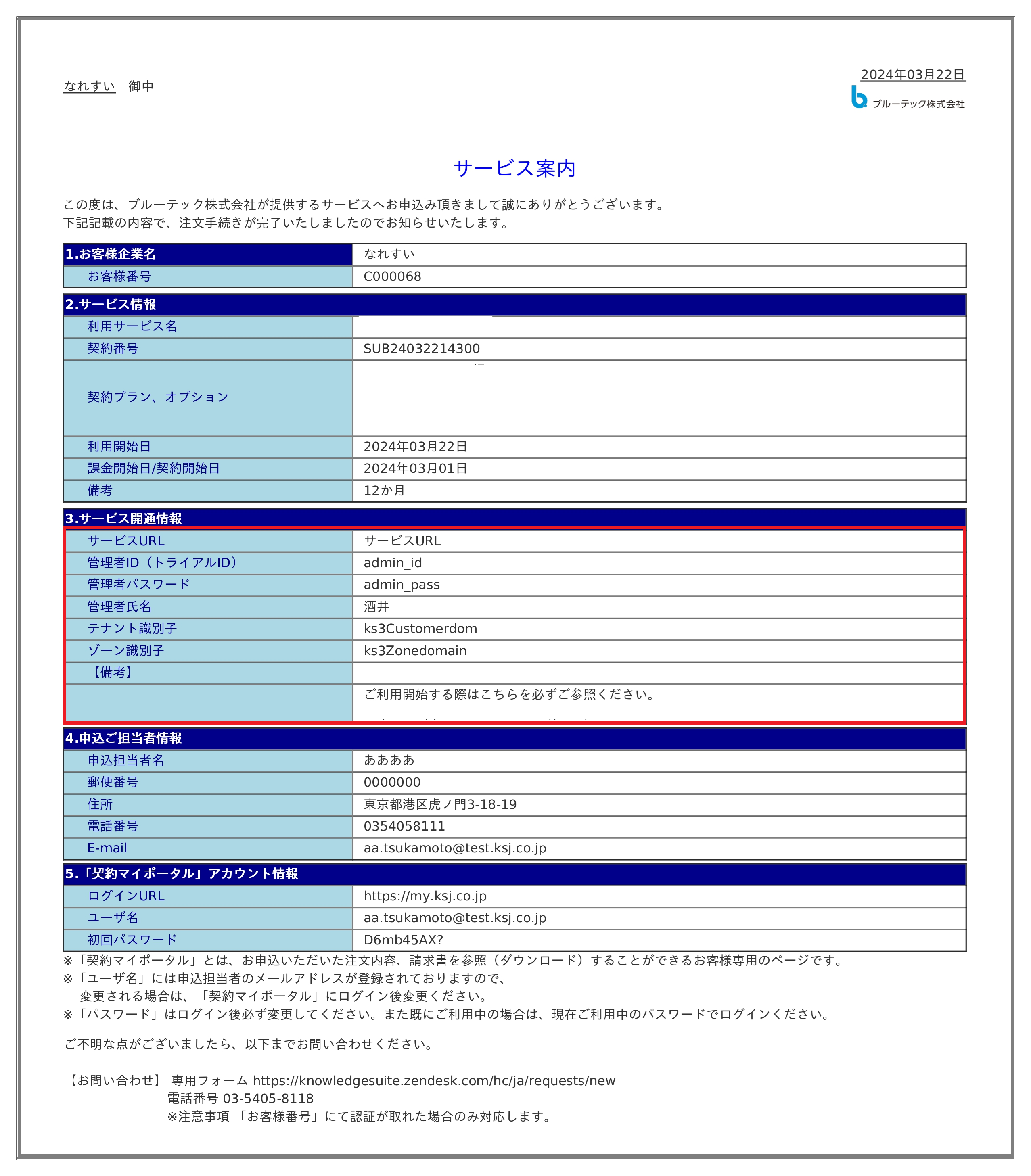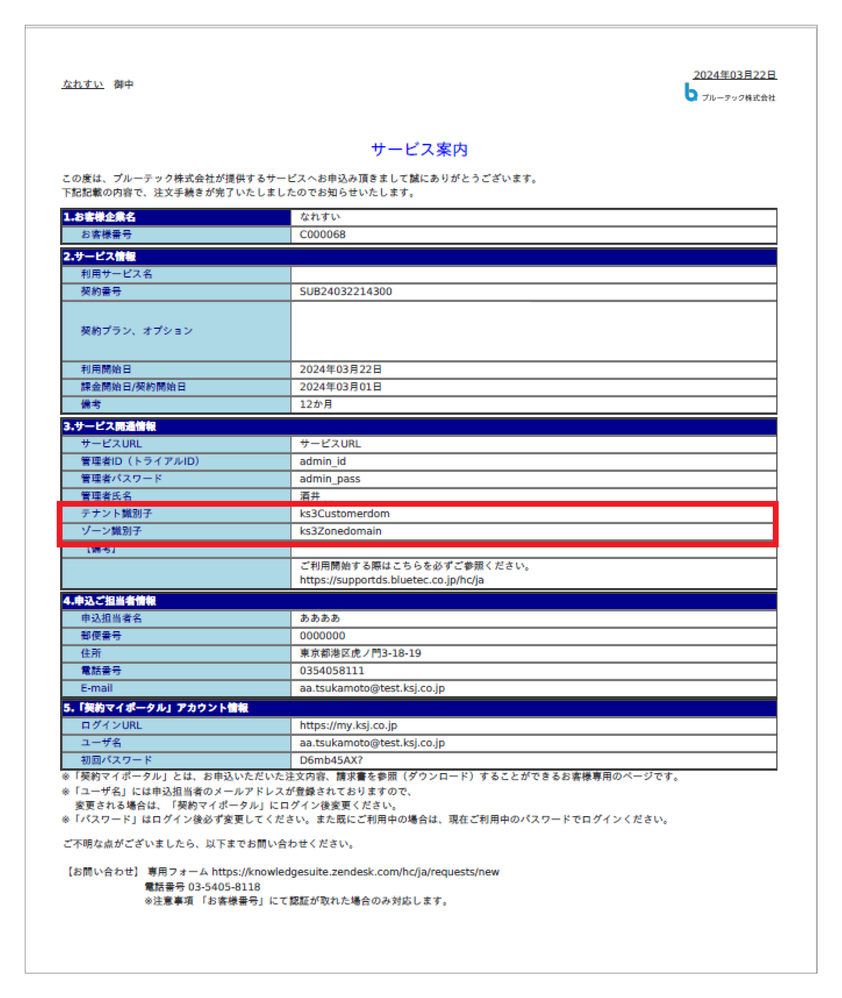 以下は、案内書のサンプルです。赤枠の部分にテナント識別子とゾーン識別子が記載されています。