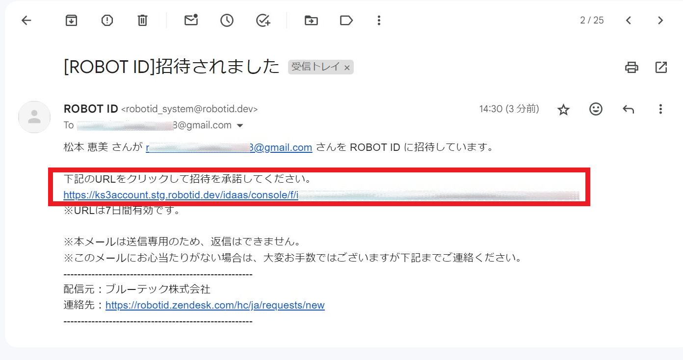 招待メールに記載されている URL の有効期限は 7 日です。期限切れとなった場合は再度自社のAIファイルボックス管理者より招待してもらう必要があります。