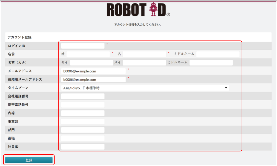 通知用メールアドレス ユーザーがROBOT ID からの通知を受信するアドレスを入力してください。上の項目と同じアドレスも登録可。