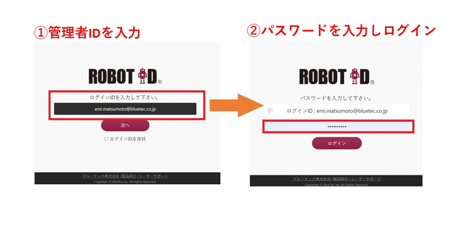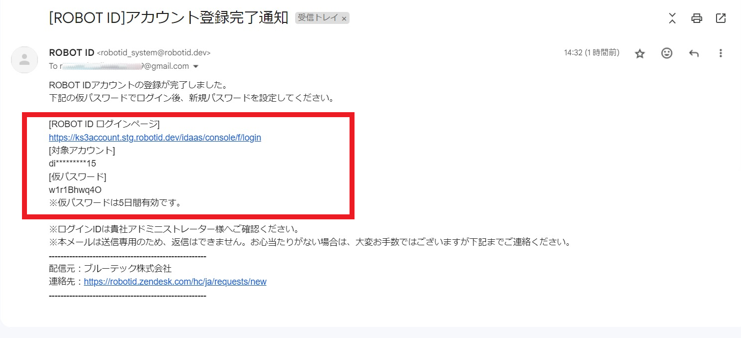 4.アカウント登録完了メールが届きます。URLを押下し、先ほど登録したログインIDとメールに記載された仮パスワードを使用して、ROBOT IDにログインしてください。