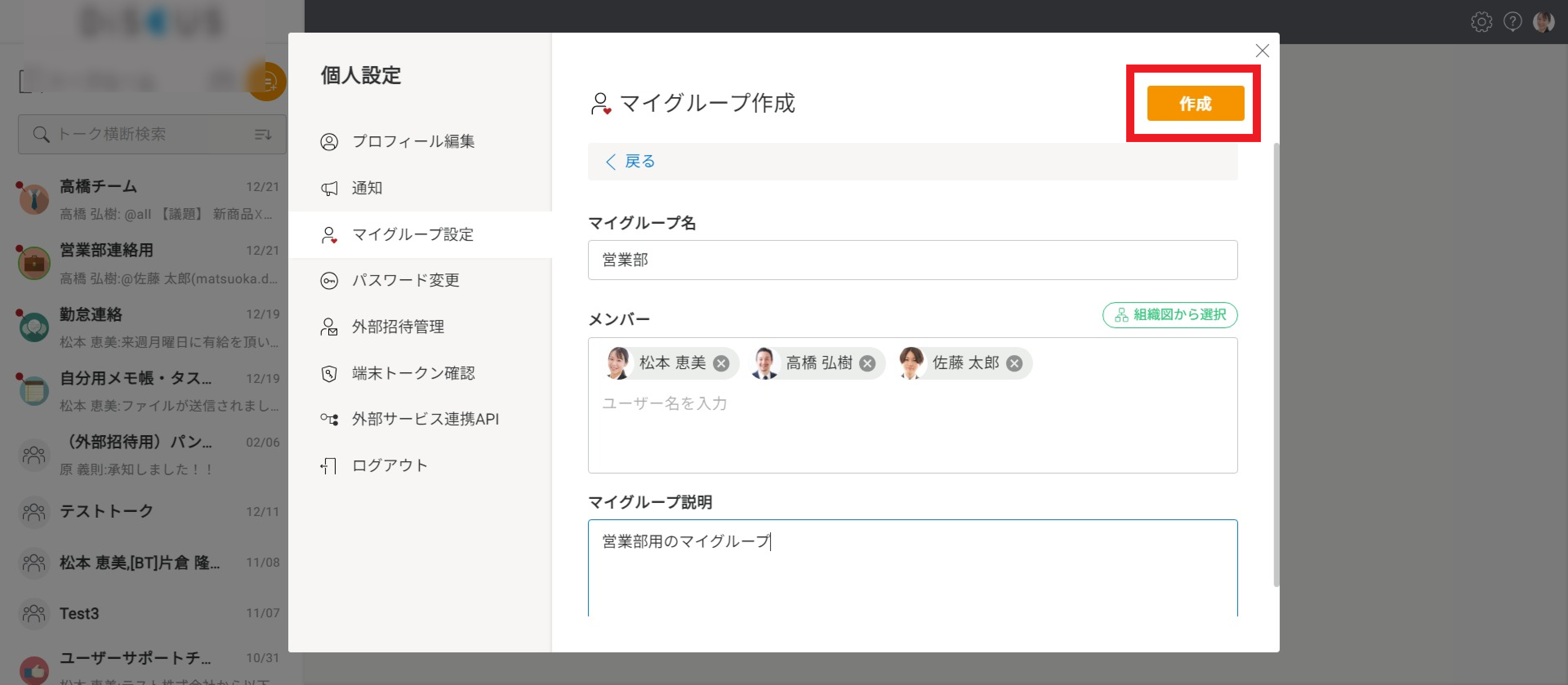 マイグループを設定しておくことで、トークルームにメンバーを追加する際に、組織図から一人ずつユーザーを選択して追加するといった作業を省略できるため、ぜひご活用ください。