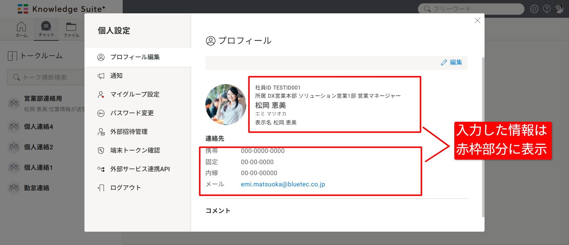 会社電話番号~社員IDまで 全てAIファイルボックス上で表示されるプロフィール情報となります。