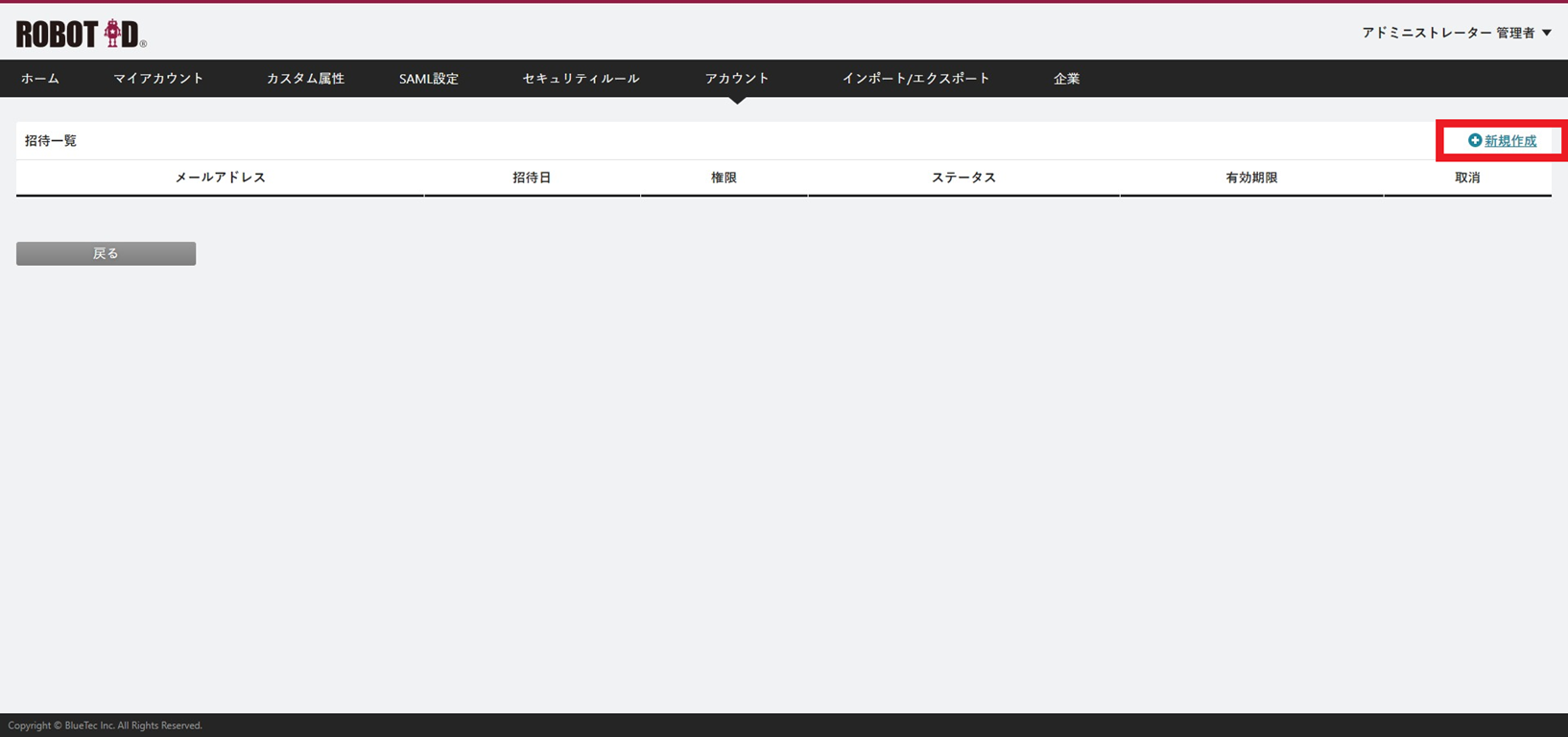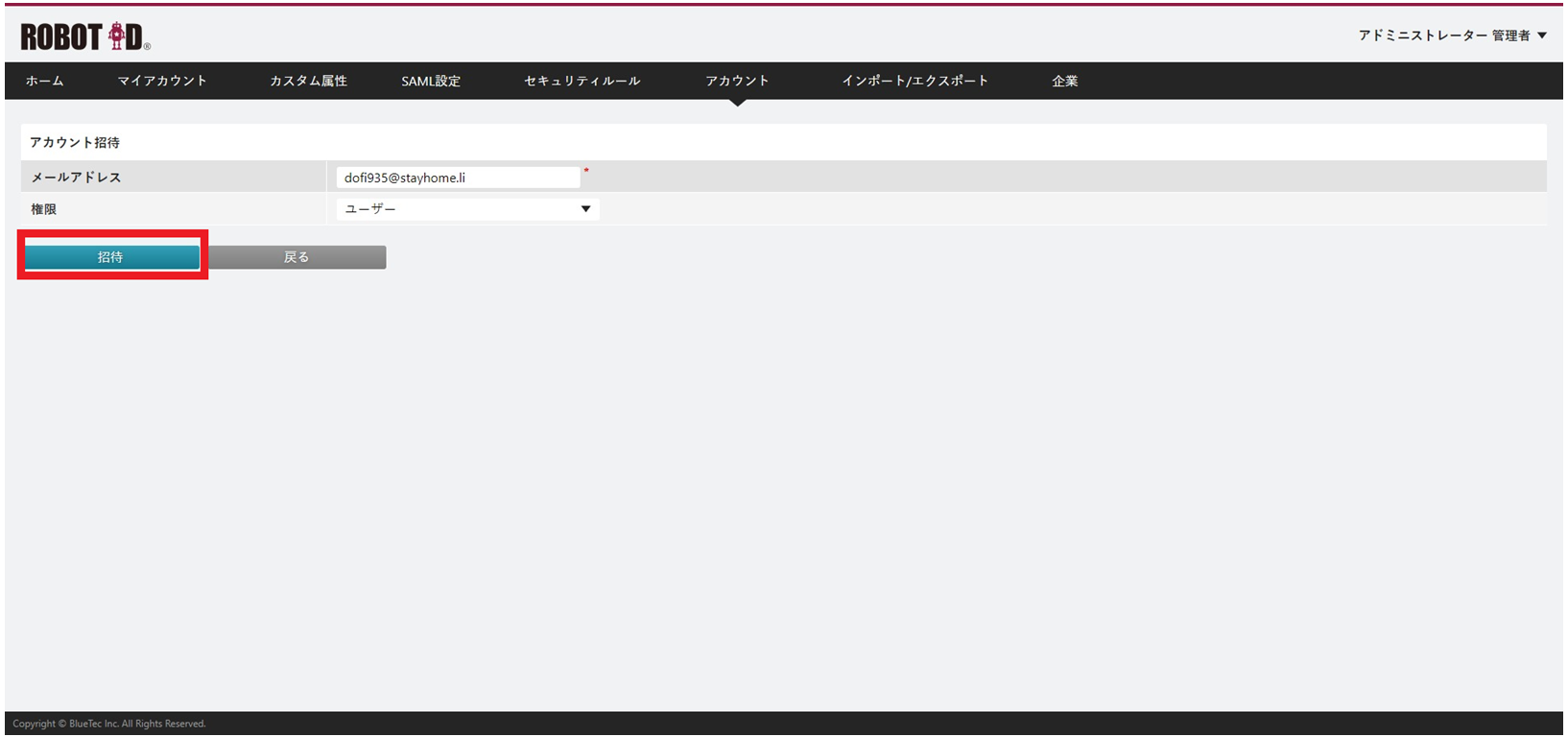 権限 登録するユーザーのROBOT ID上での権限範囲を選択します。基本的には「ユーザー」を選択してください。ここで設定される権限はあくまでもROBOT ID上での権限となり、AIファイルボックス上での管理者権限とは異なります。