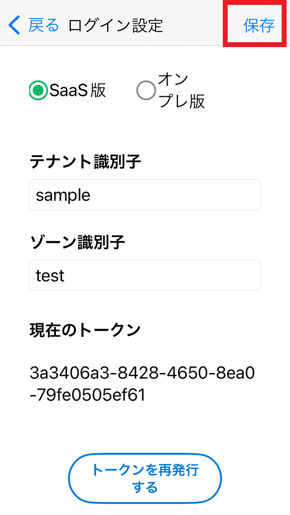 3.テナント識別子の入力後、画面右上の保存を押下することでアプリ版の初期設定は完了です。