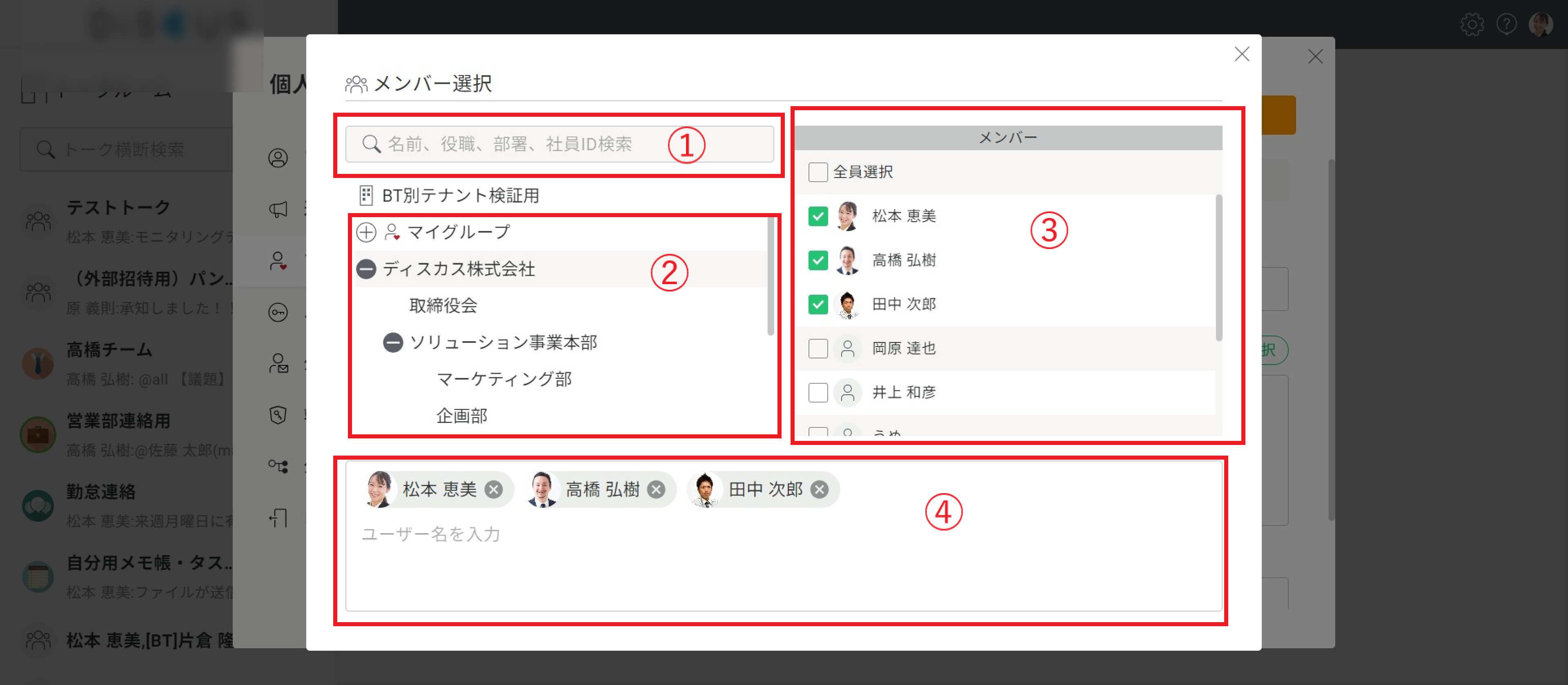 ① 追加したいメンバーを、名前、ID、部署などの情報で検索します。