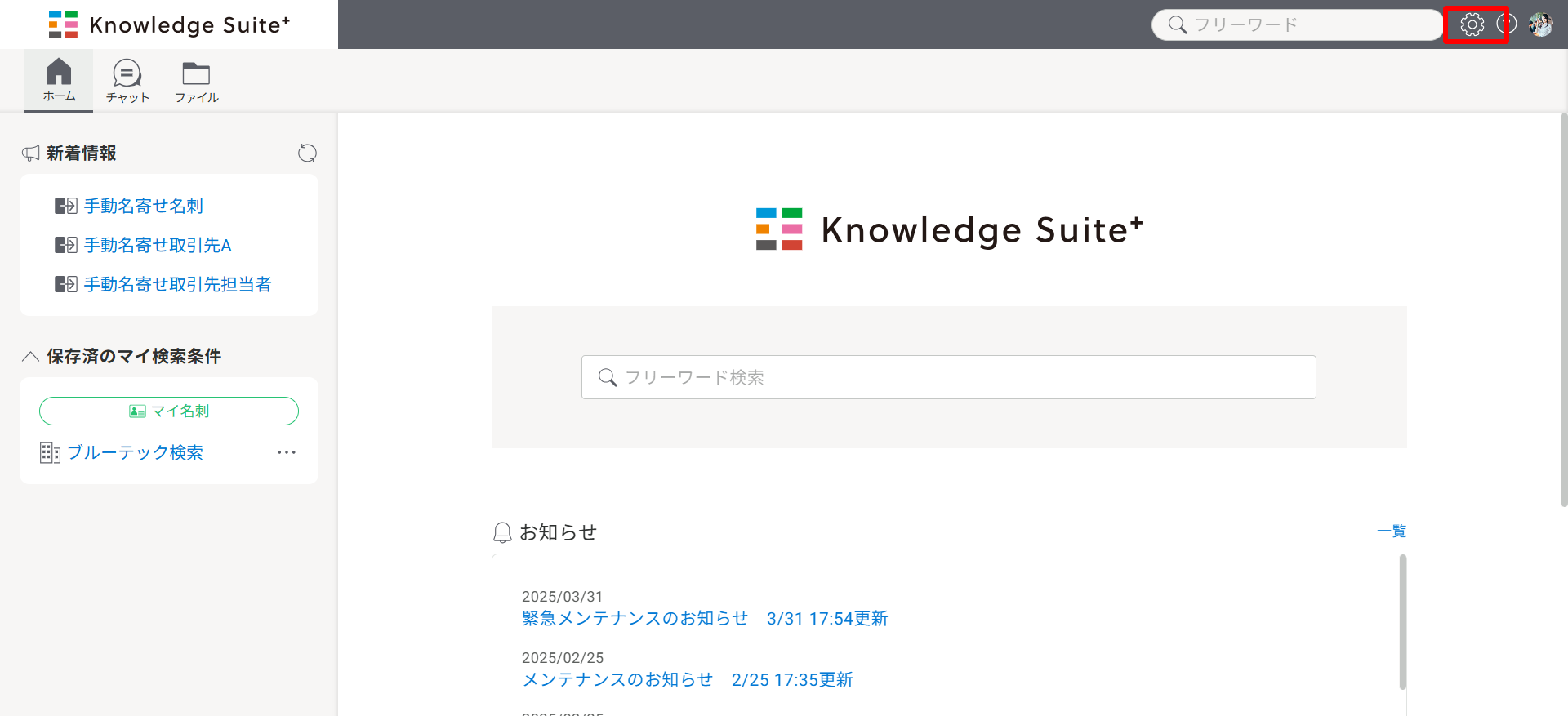 管理設定はAIファイルボックスにログイン後、画面右上の歯車アイコンを押下することでアクセスできます。